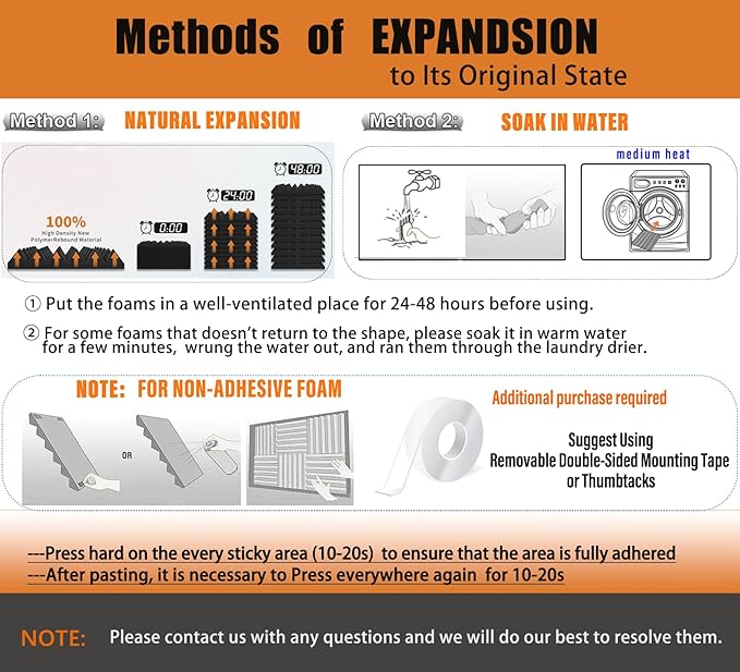- Sound Insulation Soundproof Foam. - We sell noise cancelling foam panels are non-adhesive. So We recommend using 3M Double Sided Foam Tape that with strong adhesive or pin to install them. Perfect for home studios, offices, gaming rooms, and more, these panels can also good to diy ,you can cut to fit custom shapes and sizes. Please note: Products are packaged in a compressed state.For some products that cannot expand well, they will take longer to expand naturally. Or just put the product in the dryer for a few minutes to expand it to its original shape.