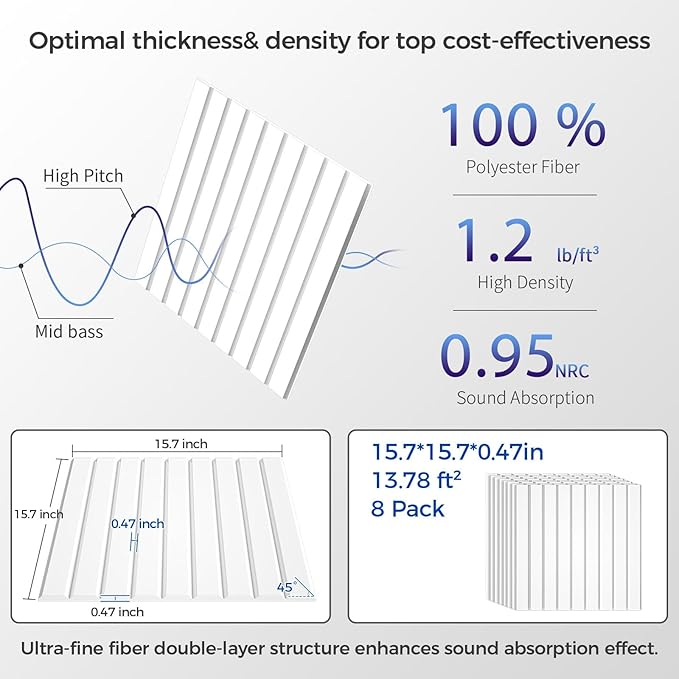8 Pack Large Soundproof Wall Panels, 15.7 x 15.7 x 0.47 in Sound Proof Foam Panels for Walls, 1.2lb/ft³ High Density, Thicker 0.47in, Acoustic Panels, Sound Dampening Panels White