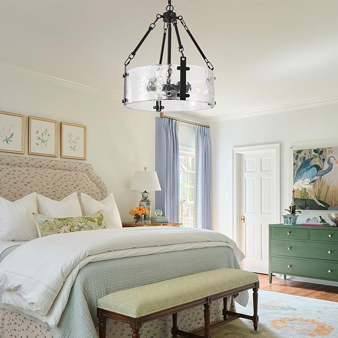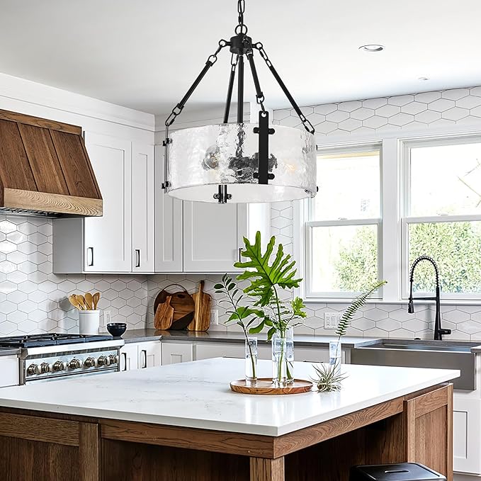 - 【Modern Elegant Design】The water ripple effect of this modern textured glass chandelier is handmade, with each piece of glass featuring a unique irregular texture. Combined with the matte black metal finish of the Round dining room chandelier, it creates an impressive and stylish look that makes the glass drum chandelier easy to incorporate into a variety of interior styles.