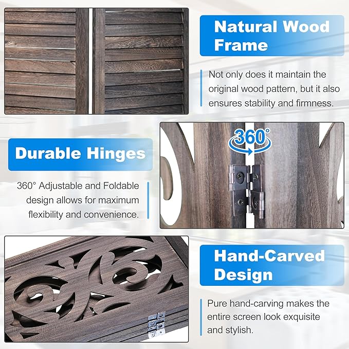 4 Panel Room Divider 5.6FT Wood Carved Room Dividers, Folding Privacy Screens Portable Freestanding Partition Wall Dividers for Bedroom, Office, Rustic Brown