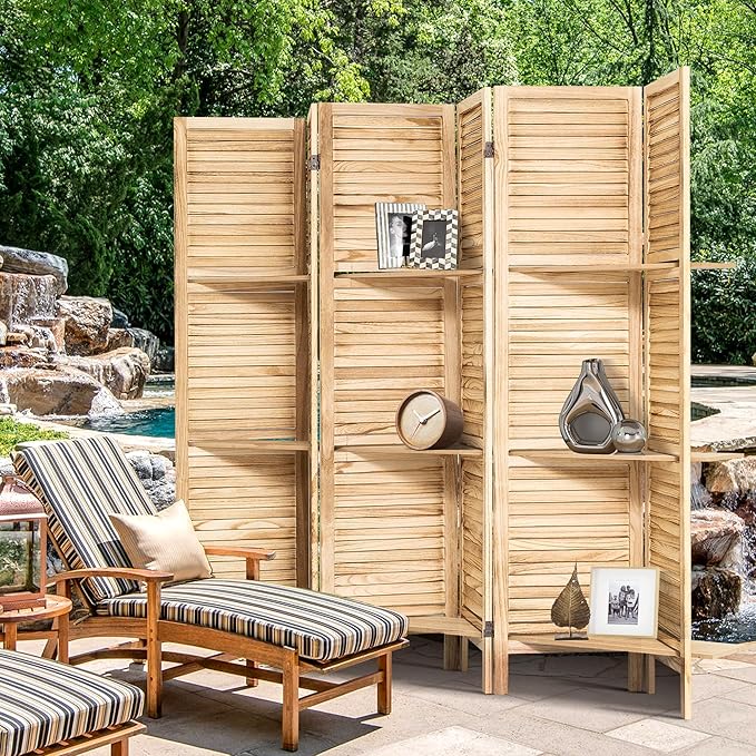 6 Panel Room Divider 5.6FT Louvered Design Room Dividers with Display Shelves Folding Privacy Screens Portable Freestanding Partition Wall Dividers for Bedroom & Office, Natural Wood