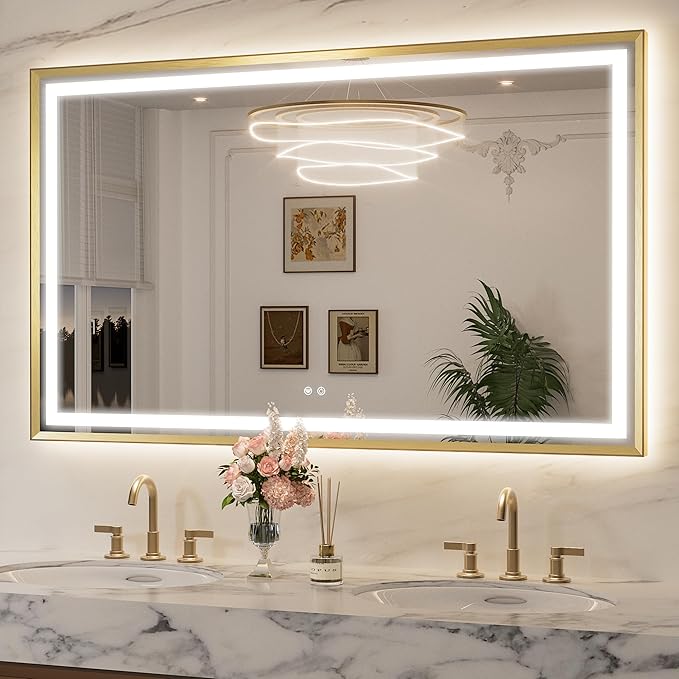 Keonjinn 60 x 36 Inch Gold Bathroom LED Mirror with Frontlit & Backlit, Large LED Vanity Mirror, HD Tempered Glass, Aluminium Alloy Beveled Frame, 3000K/4500K/6000K, Dimmable, Defogging, Shatter-proof