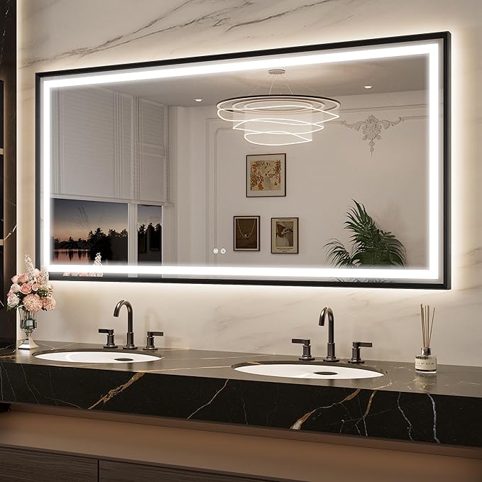 - 【Frontlit & Backlit Lighting】Unique construction design in this bathroom LED Mirror delivers both front and back lighting in one touch, combining brightness for daily tasks with ambient glow for a relaxing atmosphere. UL-certified LED Lights strips provide up to 50,000 hours of reliable illumination.