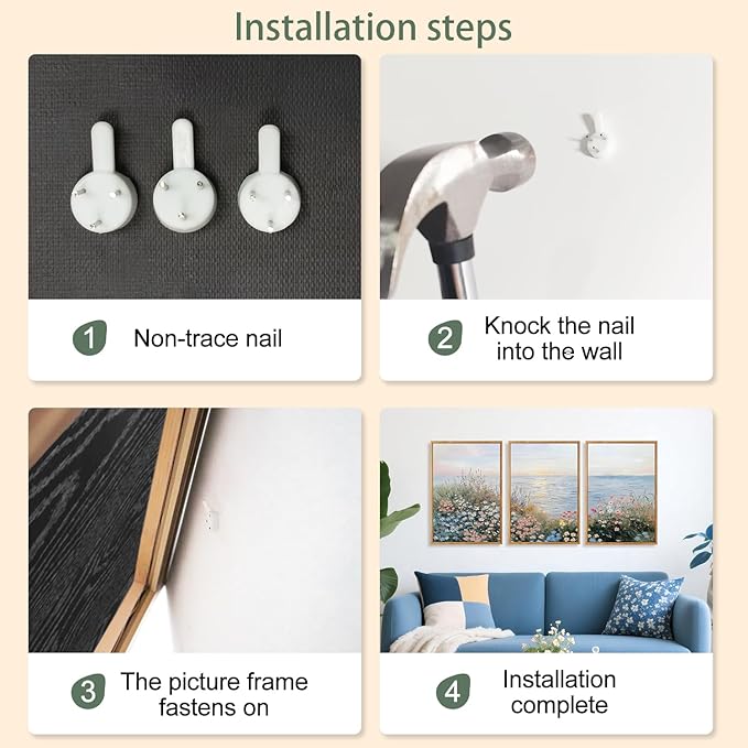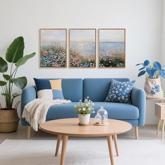 - OCEAN-INSPIRED ARTISTIC DESIGN: This three-piece canvas wall art set showcases a serene coastal scene with vibrant wildflowers and calming sea views. The use of pastel colors and impressionistic style creates a tranquil and timeless aesthetic that will add a touch of nature to any room decor.