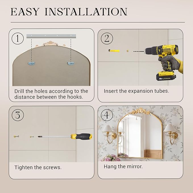 - Easy to Install: Effortlessly hang the Arched Mirror with the 2 hooks and included screws; In just a few easy steps, you can mount it securely on your wall, adding instant charm to any room