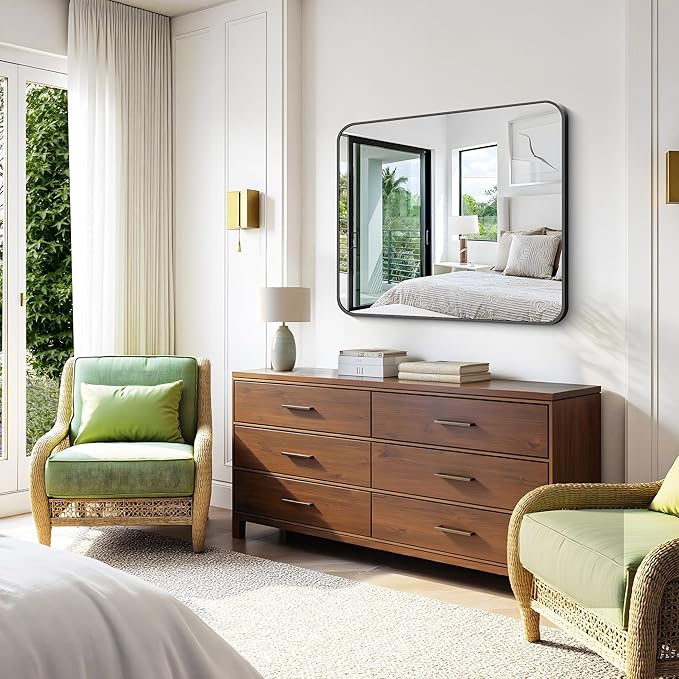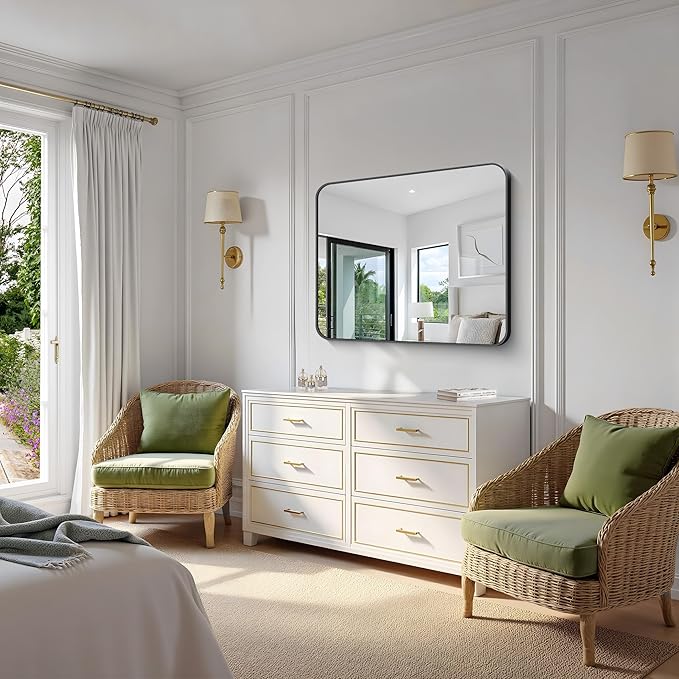 KOCUUY Bathroom Mirror 36"x40", Black Rectangle Mirrors for Wall, Large Metal Framed Vanity Mirror with Rounded Corner for Bedroom Living Room and Entryways Hangs Horizontal/Vertical