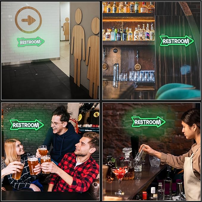 - Restroom Arrow neon sign: measures 15.35 x 5.12 inches with high transparency acrylic sheets and LED lights to create a more suitable environment and atmosphere for personal care