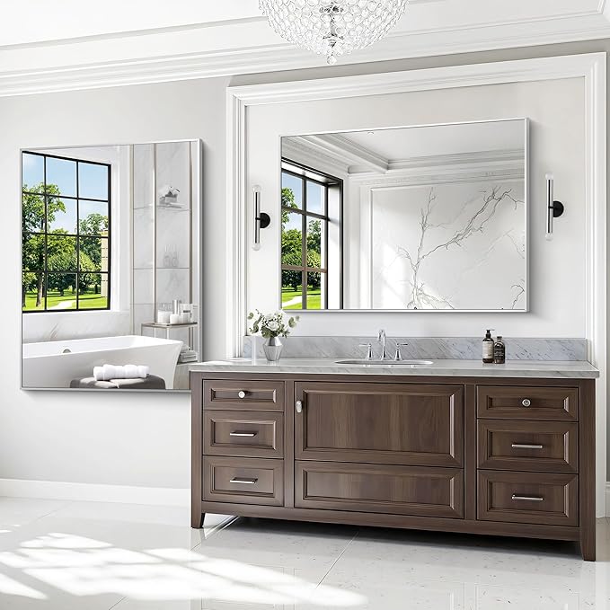 - HIGH SAFETY : The package for this wall mounted bathroom mirror is well,Sturdy and reliable,equipped with explosion-proof film and explosion-proof glass,even if impacted by external forces,silver frame mirror glass will not break and splash,ensuring higher safety and protection.