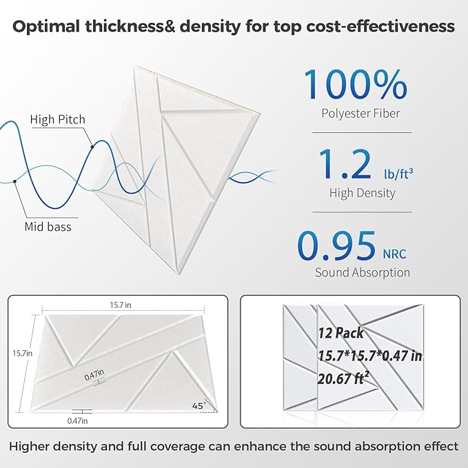 12 Pack Large Self-Adhesive Soundproof Wall Panels, 15.7 x 15.7 x 0.47 in Sound Proof Foam Panels for Walls, 1.2lb/ft³ High Density,Large Size Acoustic Panels, Sound Dampening Panels White