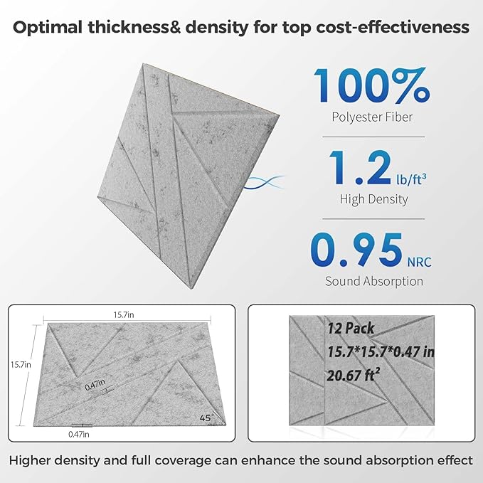 - 【Perfect DIY】: Soundproof wall panels with modern design concepts provide your space with unique decorative charm. Adopting a beautiful design with 45° chamfers, the wall noise blocker with this unique design pattern can be freely spliced and placed. You can assemble it into any DIY shape according to your decoration needs. It has strong plasticity and different rotation directions can create different patterns, large-size acoustic panels make the space layout more flexible and beautiful.