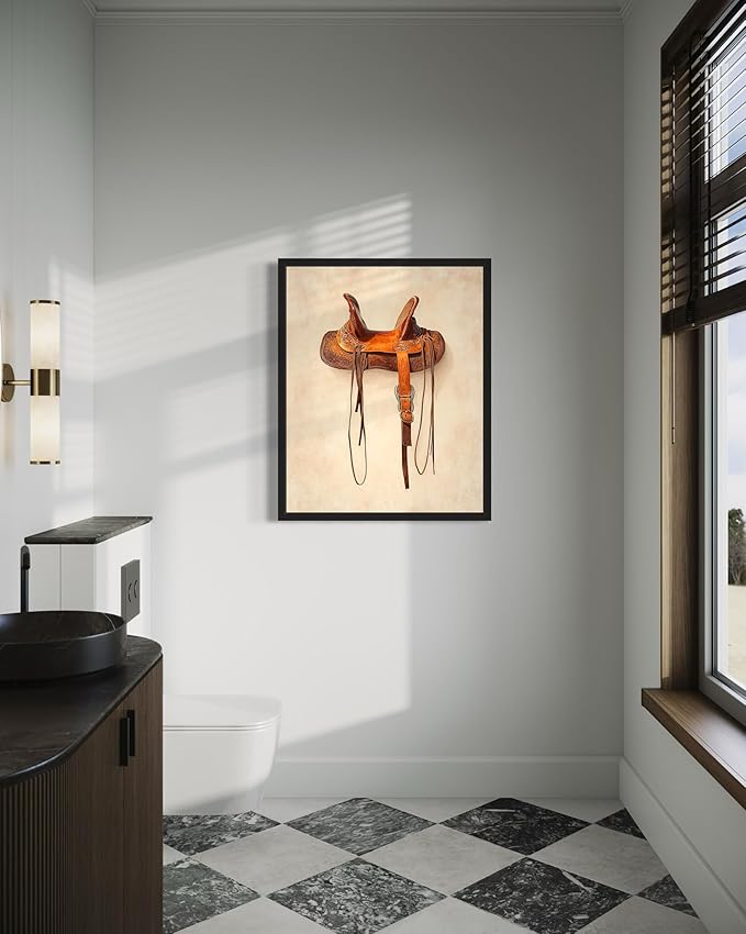 Cowboy Saddle Art Print Poster Wall Art, Western Country Farmhouse Wild West for Bedroom, Bathroom, Living Room Art Decor 58 (Cowboy Saddle, 16 x 20 inches, Black Frame)