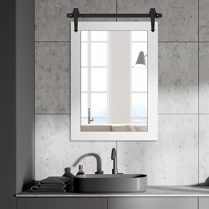 Bathroom Mirror for Over Sink 26”x40” Farmhouse Barn Door Mirror Rustic Wood Framed Wall Mirror for Bathroom, Bedroom, Entryway (Bright White)