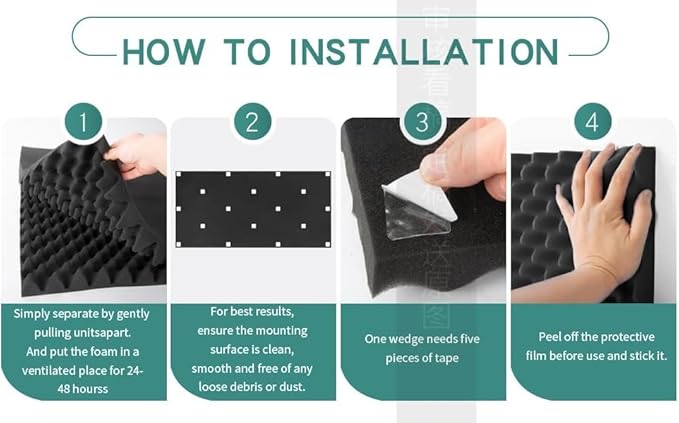 - 【Easy to install】Our Acoustic Panels come with double tape sticker and installation notes,18 pcs sticker for each foam, No Special Tools Required for Installation.When use stickers,please make sure the wall is flat and free of foreign matter , which will affect the effect of the paste.
