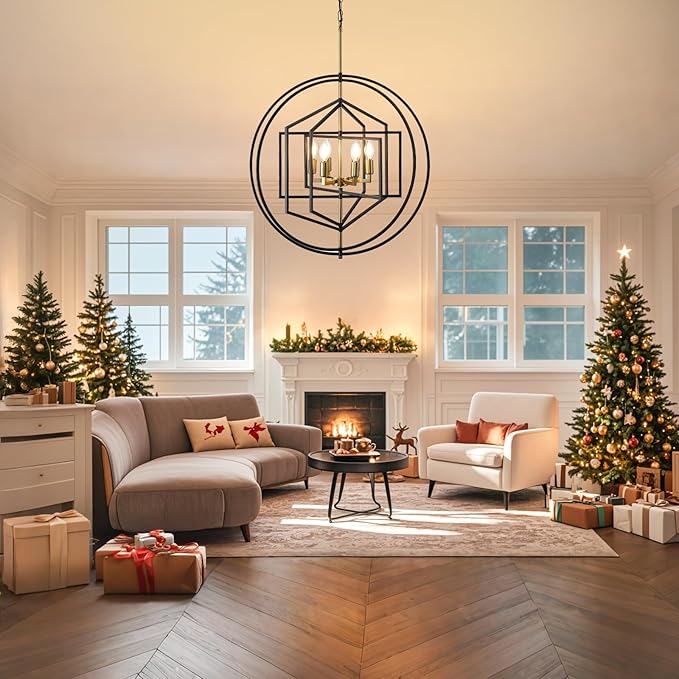 - ✨Large Round Chandelier Dimension - This high ceiling chandelier size: Dia 26"X H 26", This black and gold farmhouse chandelier comes with 59 inches of adjustable height chain with a minimum hanging height of 32“ and a maximum hanging height of 92”, you can adjust the right height to suit your needs, this staircase chandelier is suitable for any stylized ceilings.