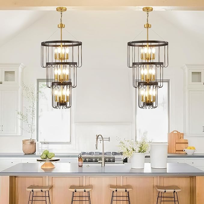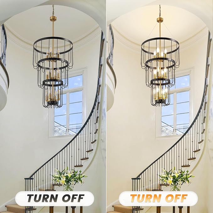 Black and Gold Chandelier, 12-Light Farmhouse Chandelier for Entryway, Industrial Foyer Lighting Fixtures, Large Chandeliers for High Ceilings, Modern Hanging Pendant Lights for Staircase, Entryway