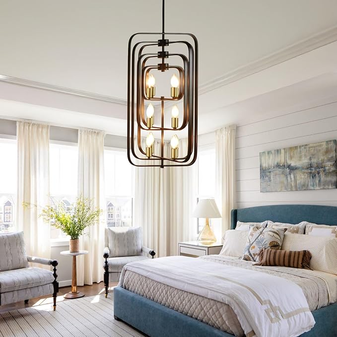 - ✨【Black and Gold Chandelier Inspired Designs】This large foyer chandelier has a black Lantern frame and a Gold central lamp base made from. It is the perfect complement to the lamps in your home. This entryway chandelier the perfect choice for you! More and more customers are picking this fixture for better comfort and to meet the new popular styles. This lantern pendant light requires no assembly. Very easy to use. Beautiful farmhouse chandelier for entryway is suitable for all decorating styles.