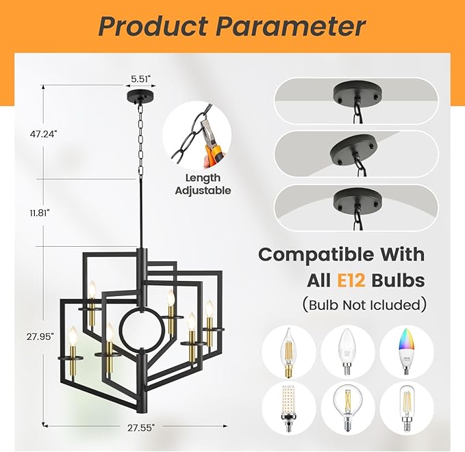 - ✨Farmhouse Chandelier Compatible Information - The farmhouse pendant light comes with 6 x E12 Socket holder, Applicable to any E12 bulb, such as LED/CFL, incandescent or fluorescent (Bulb not included). Fully dimmable with dimmer bulb and dimmer switch. (dimmer switch not included)