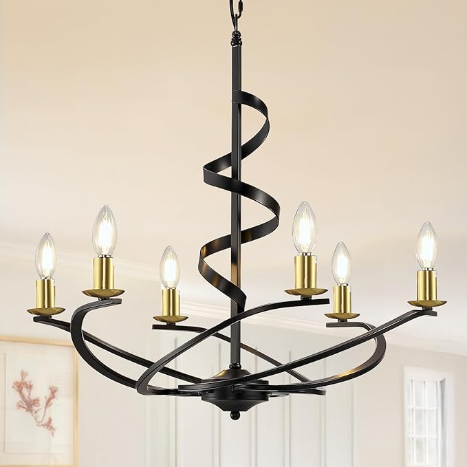 Black and Gold Chandelier, 6-Light Farmhouse Chandeliers for Dining Room, Rustic Kitchen Island Lighting, Modern Chandelier for Living Room, Hanging Pendant Lights for Bedroom, Foyer, Staircase, Entry