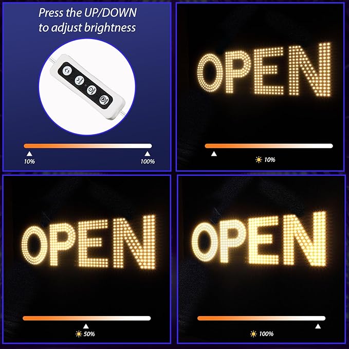 - Adjustable Brightness & 3 Modes: Easily adjust the brightness of our LED open sign by pressing the button on the switch. Choose from 10%-100% brightness. The LED business open sign also comes with three operating modes: constant on, flash and fade.