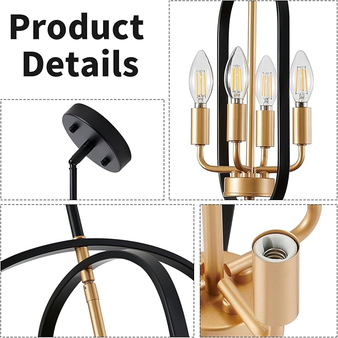 - Height/Light Adjustable—— Black chandelier light fixture size: 12.2*15.74 inch. Splice bar design kitchen chandelier is more stable than normal chain, you can adjust the position and height of the rustic chandelier as needed. In addition, this small black chandelier can be installed not only on flat ceilings but also on sloping ceilings. The black and gold light fixture can be used with compatible dimmer switch and dimmer bulb (bulb and switch are not included, E12 bulb power is up to 40W).