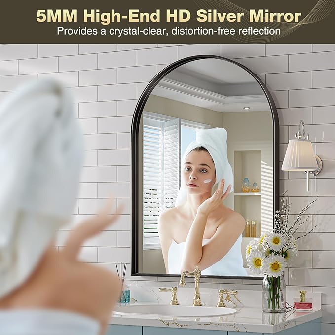 - HD Silver Arch Mirror: Our arched bathroom mirror are made of high-end silver mirrors, making our silver mirror 35% brighter than the traditional aluminum mirror, reflectivity increased to more than 90% without any visual distortion. Provides a crystal-clear, distortion-free reflection, ensuring the image does not seem distorted at all angles and distances