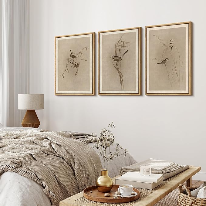 MUDECOR Framed Wall Art Print Set Vintage Bird Wheat Ear Illustrations Modern Art Boho Decorative Colorful Chic for Living Room, Bedroom, Office - 24"x36"x3 Natural