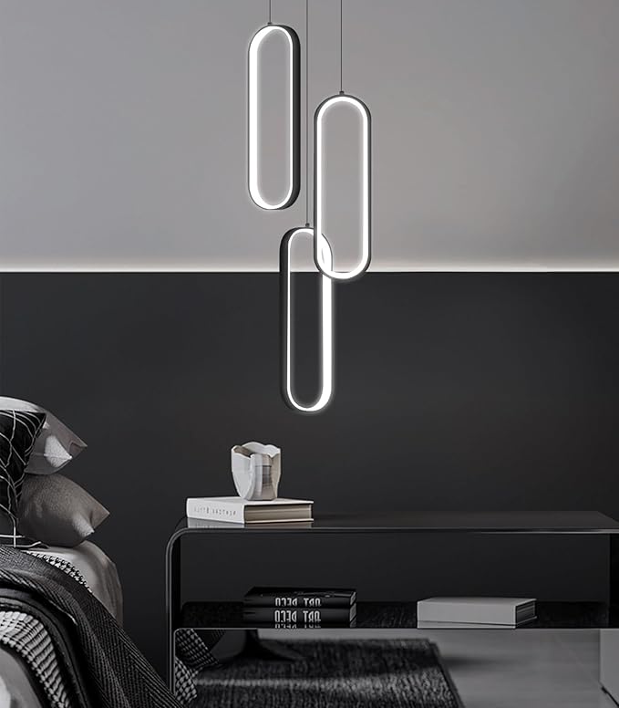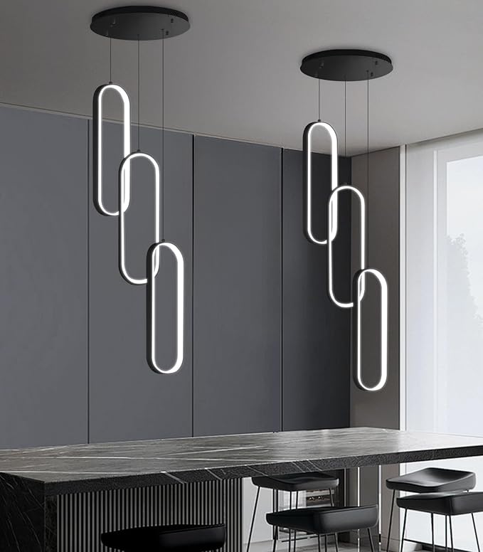 - 【Wide Applications】Design various shapes of kitchen island 3 rings led chandelier by adjusting the strings of rings easily via cable locking pins. Black ceiling light, cable length adjustable 3.9-59 inch. Suitable for any room like a kitchen Island, dining room, foyer, staircase, entrance, hallway, villa, living room, study room, showroom, hotel, etc