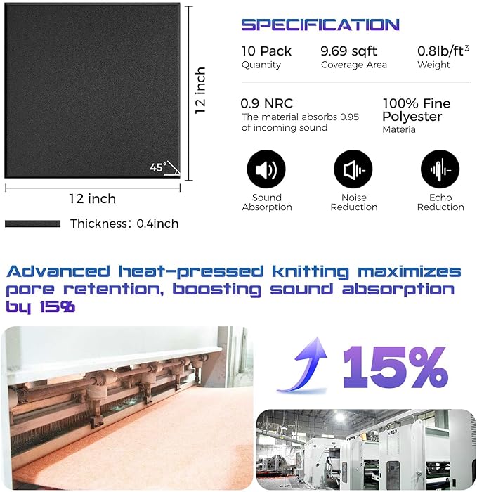 - Improve Sound Quality and Clarity: Our studio sound proof foam panels have premium microfiber, combined with advanced needle punching and heat pressing technology, retaining more pores, improving sound absorption by 15%, effectively reducing disruptive echoes and reverberations. he innovative design ensures excellent sound absorption and noise reduction performance, allowing you to enjoy a quieter and clearer audio experience.