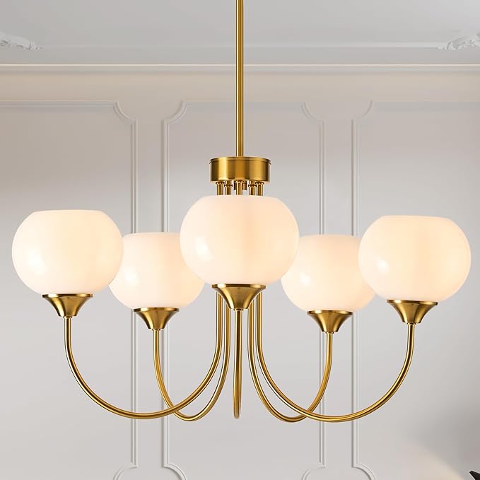- 【Modern Gold Chandelier】The vintage globe pendant light fixture is composed of milk white globe glass and brass gold metal frame, with a delicate and elegant design. The unique milk glass makes the lighting appear soft and warm, adding a comfortable and romantic atmosphere to your space. Widely applicable to scenarios such as restaurant, bedroom, kitchen, dining room, foyer, etc