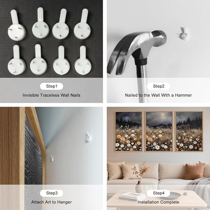 - 【Moody and Calming Wall Art】The size of the framed canvas wall art set is: 16x24 inchx3pcs (40x60cmx3pcs).This triptych depicts a dreamy natural scene. The foreground has a meadow with colorful daisies. Mist lingers in the middle ground. The background shows a dark forest under a moody sky, with a pale moon shining through clouds, creating a tranquil yet mysterious vibe.