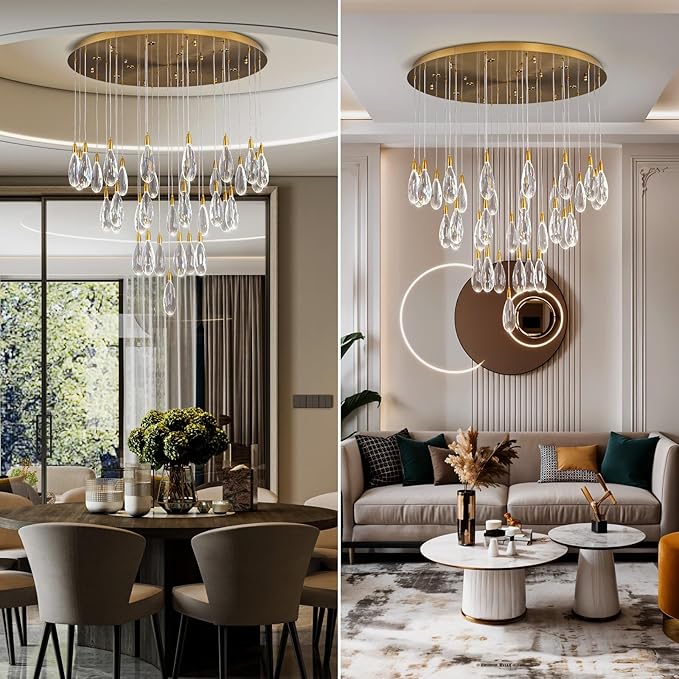 - 【Luxury Crystal Chandelier】This modern crystal chandelier is made of 100% premium K9 crystal, paired with a golden aluminum alloy frame, creating a highly elegant and luxurious look for your home. Its simple yet timeless design makes it perfect for high ceilings, living room, foyer, staircase, entryway, dining room, bedroom, kitchen, home office, hallway, salon, hotel, cafés, etc.