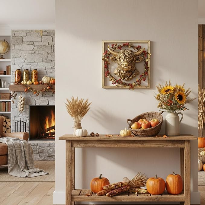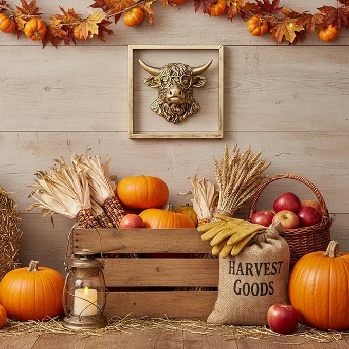 Animal Heads Wall Decor (Includes Metal Frame) Resin Animals Sculptures Head Wall Hanging Decoration Gold vintage Wall Sculpture for Living Room Bedroom Office(Highland cattle)