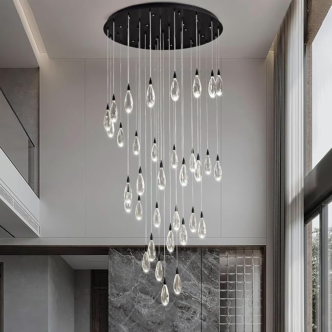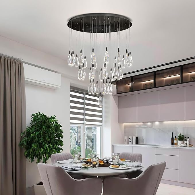 - 【Luxury Crystal Chandelier】This modern crystal chandelier is made of 100% premium K9 crystal, paired with a black aluminum alloy frame, creating a highly elegant and luxurious look for your home. Its simple yet timeless design makes it perfect for high ceilings, living room, foyer, staircase, entryway, dining room, bedroom, kitchen, home office, hallway, salon, hotel, cafés, etc.