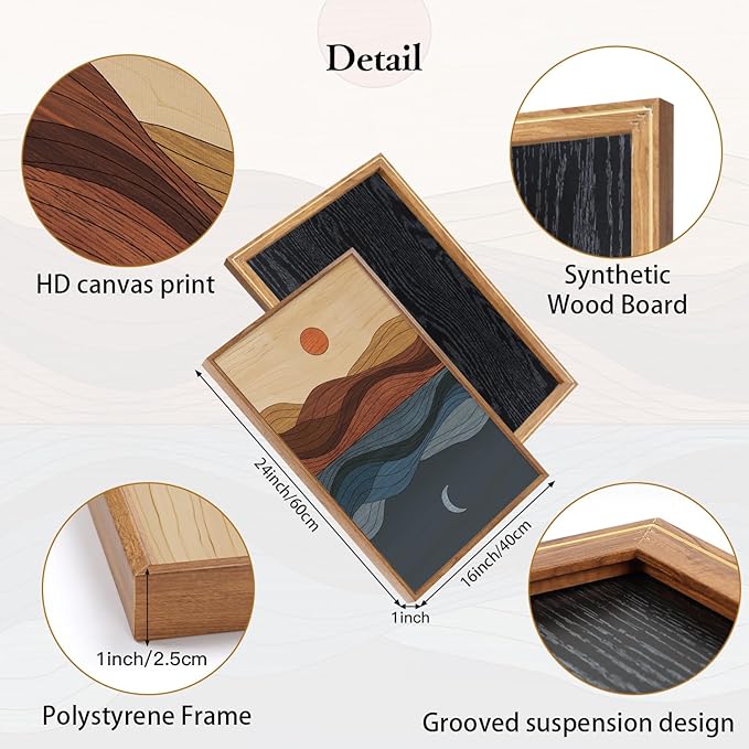 - MODERN LANDSCAPE STYLE WALL ART: The decorative paintings feature a modern landscape design with earthy tones of brown, beige, and blue as the primary colors. They skillfully integrate sun moon elements of nature-inspired mountain sea motifs and flowing lines to create a serene and contemporary aesthetic.