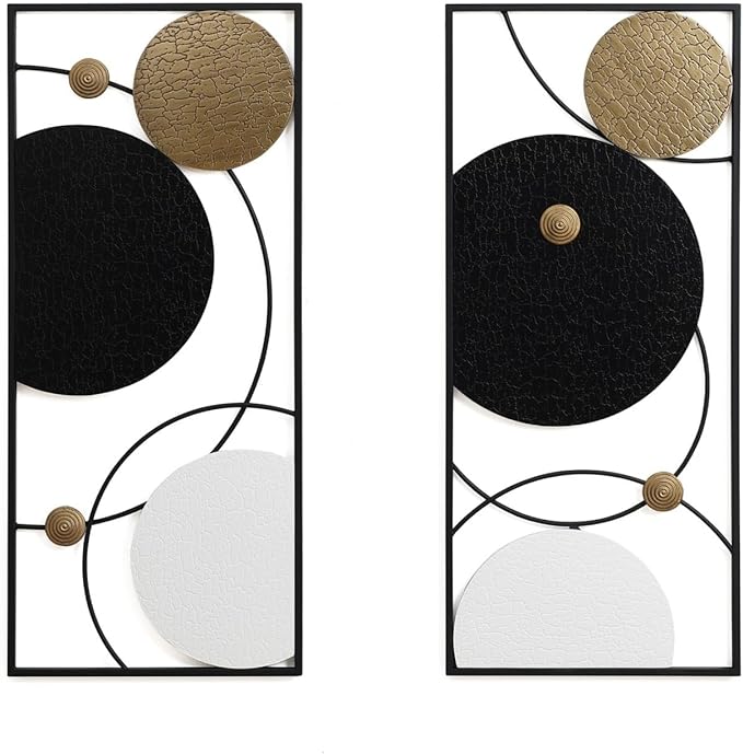 - Modern Metal Art Wall Decor: Featuring a striking combination of circles and flowing lines, this abstract rectangular 2 pieces metal wall decor blends black, gold, and white tones to create a sophisticated and artistic statement.