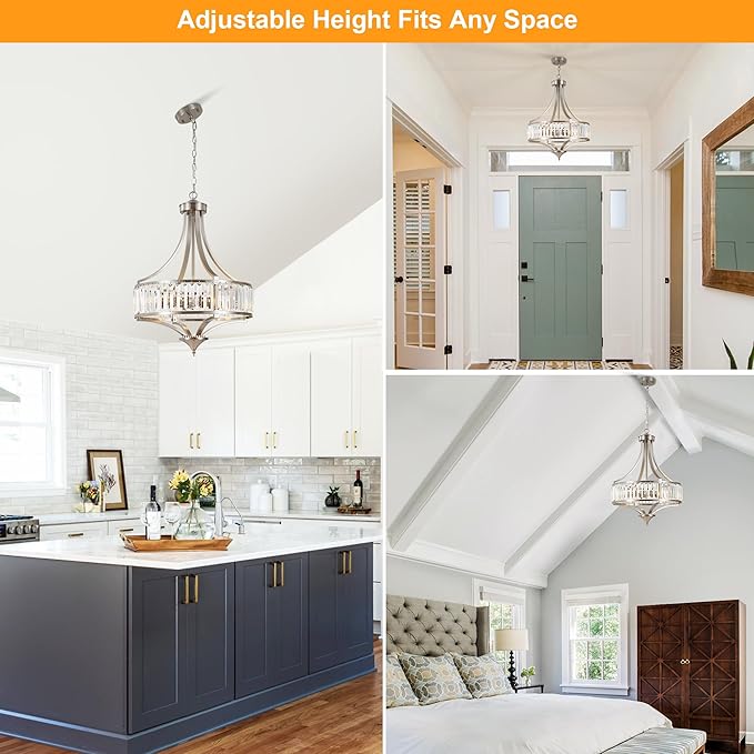 - Modern Farmhouse Style: Brushed nickel crystal chandelier is crafted by skillful artisans. The crystal strips in the main part are skillfully arranged to form an elegant circular structure. Whether it is in the common living room where you spend time with your loved ones, the dining room where you enjoy cooked meals, the chic chandelier fits right in to light up every moment spent inside the comfort of your home.