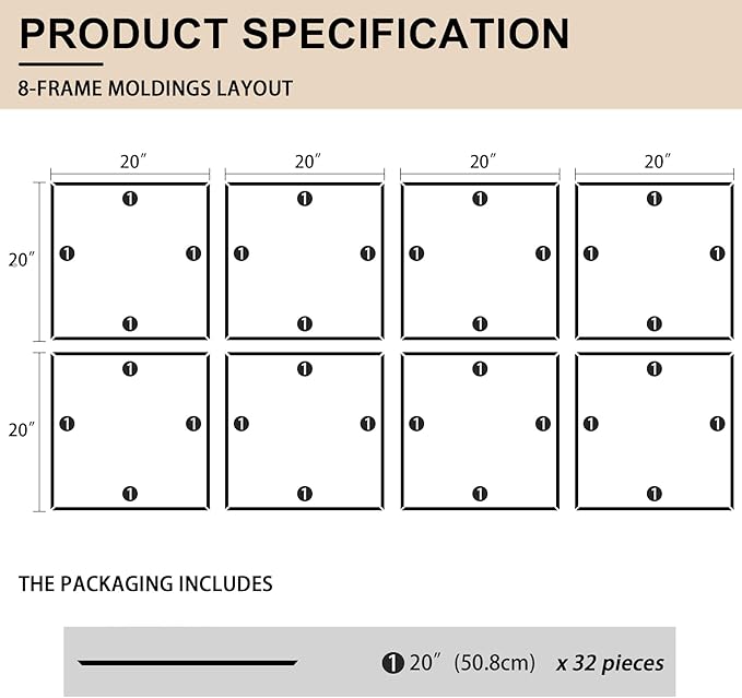 - Kit Contents: You'll receive pre-cut self-adhesive wall molding kits, with the 8-frame combo including 32 pieces