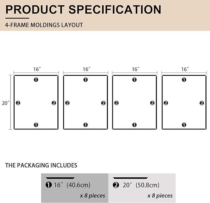 - Kit Contents: You'll receive pre-cut self-adhesive wall molding kits, with the 4-frame combo including 16 pieces
