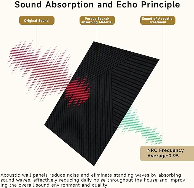 - Excellent Acoustic Performance: The acoustic panels efficiently absorb reverberation, echo, and standing waves, creating a clear and comfortable acoustic environment. With dense and uniform materials and a complete structural design, the NCR (Noise Cancellation Rating) reaches up to 0.95, achieving optimal sound absorption effects.