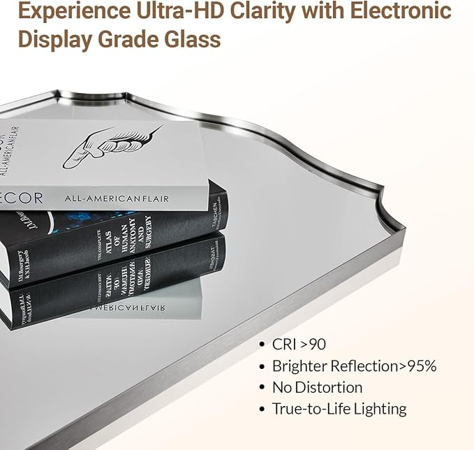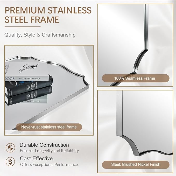 - 【Premium Stainless Steel Craftsmanship】: (N.W:34.9LBS). Crafted from stainless steel metal with oxidation-resistant properties, this large decorative mirror for wall offers enhanced stability and a longer lifespan. Shatterproof 4mm HD glass is supported by a 9mm MDF backboard (most others just 3mm ), surrounded by a 1/17" gap with unique curved corner design to give a seamless finish