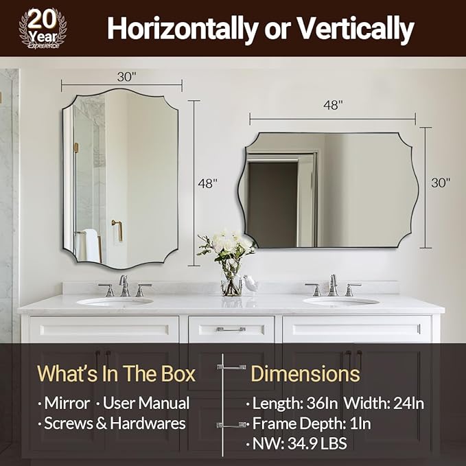 - 【Excellent Packaging & Easy Installation】: This irregular shape mirror is in fully protected packaging with a PE bag, poly foam, and master box to ensure it arrives in perfect condition. Our wall-mounted mirrors pass the rigorous drop test and come with four pre-installed hooks, making it easy to install both horizontally and vertically