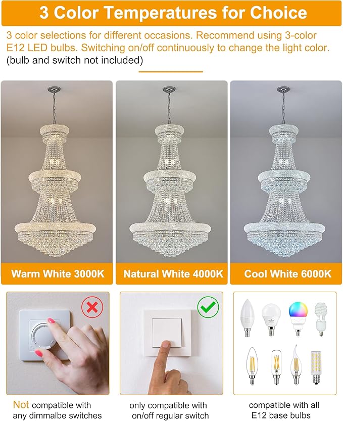 - 【Light Up Your Room】31 x E12 Bulbs (Not included) will be worked well with this empire chandelier. Recommend using 3-color LED bulbs and compatible dimmer switch (Not included). You could choose which color temperature (warm white-3000K / neutral white-4500K / daylight white-6000K) would be fit for yours rooms.