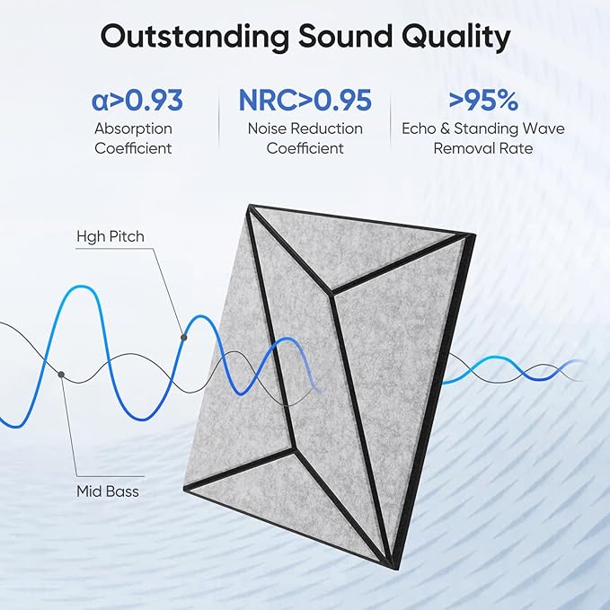 - Exceptional Sound Absorption -- Crafted with high-density polyester fiber (420 lb/m³), our acoustic panels achieve a sound absorption coefficient of up to 0.95, effectively minimizing echoes and reducing background noise for a comfortable environment.