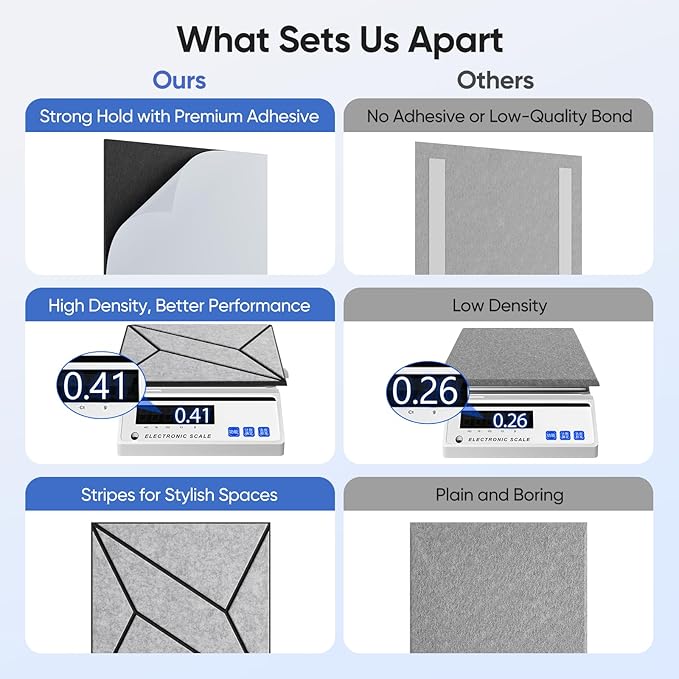 - Effortless Installation -- Each acoustic panel comes with a strong self-adhesive backing—just peel and stick. No tools, nails, or extra adhesives needed.
