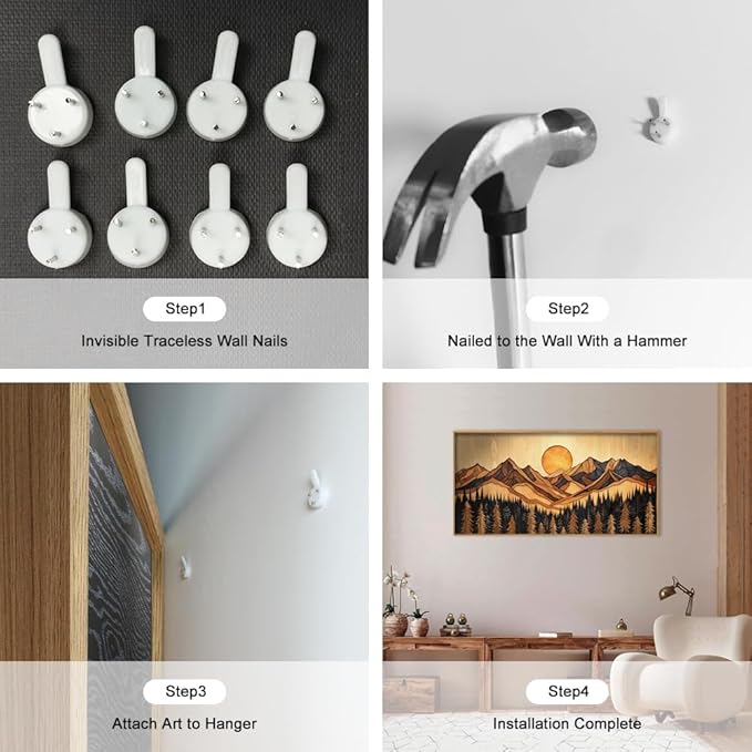 - 【Easy To Hang】This mountain sun artwork is easy to hang. Begin by determining the desired location, ensuring it is level and aligned with your preferences. Then using the included non-trace nails, securely attach the frame to the wall.