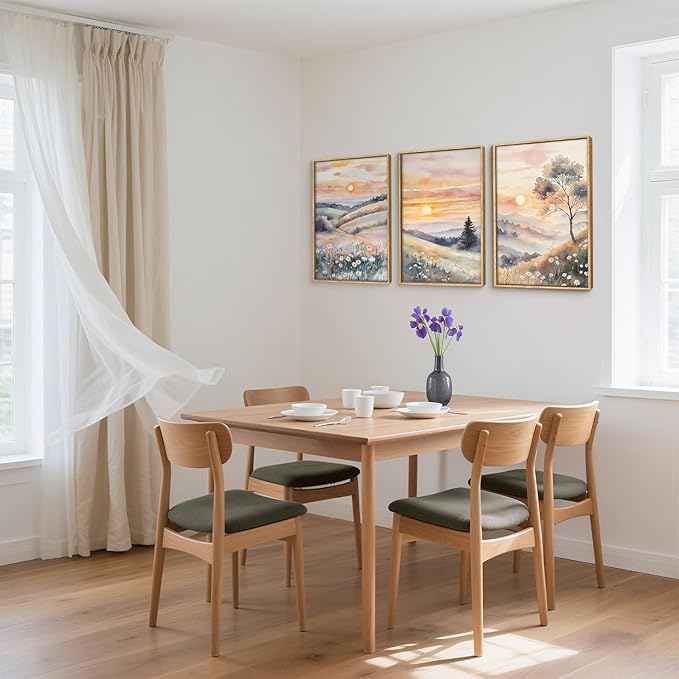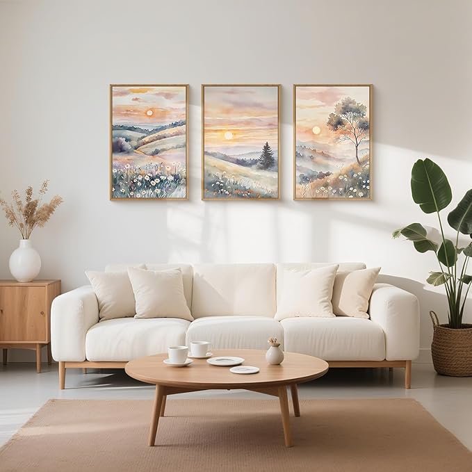 - 【Watercolor Boho Sunset Wall Art Set】This watercolor boho sunset framed canvas wall art set executed in a charming nature style, captures sunset and daisies, evoking an poetic atmosphere. Its modern organic aesthetic is reminiscent of nature charm. Utilizing this artwork as part of your decor will make your room full of poetry.