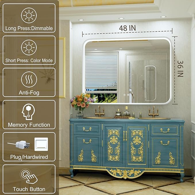 - 【Adjustable Brightness and Color Temperature】Personalize your routine with this LED bathroom mirror, featuring adjustable brightness and warm / natural / cool light for makeup, shaving, or ambient relaxation. Memory function automatically remembers the last settings