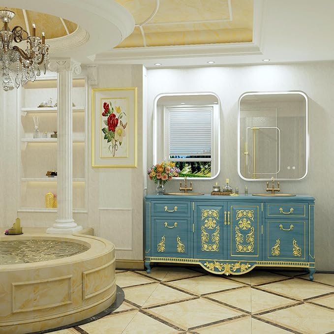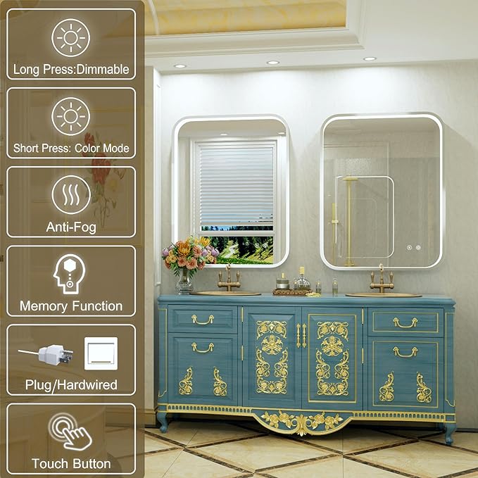 - 【Adjustable Brightness and Color Temperature】This silver LED bathroom mirror has adjustable brightness and color temperature. Long press the light button to adjust the brightness from 10% to 100%. Short press the light button to set warm/natural/cool lighting. The memory function will automatically remember the last settings