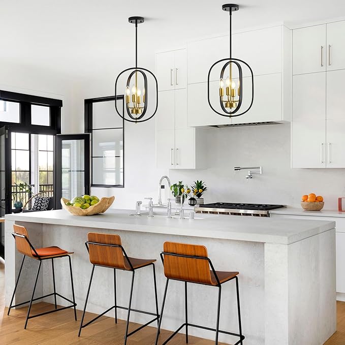 12.2'' Black and Gold Farmhouse Chandelier 4 Light Fixture for Dining Room, Kitchen Island & Entryway, Adjustable Industrial Rustic Geometric Hanging Chandelier for Living Room, Foyer, Hallway