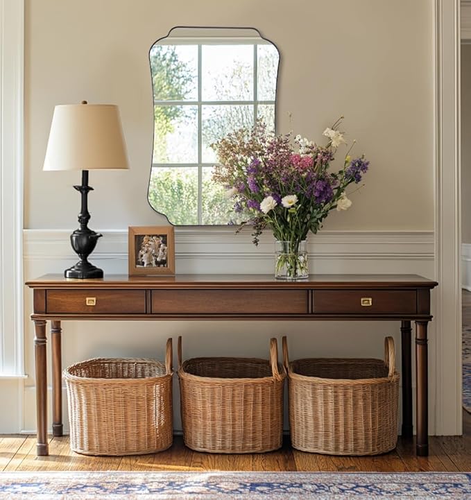 - OUTSTANDING MATERIALS: Crafted with a sturdy SUS304 frame, this symmetrical wall mirror is rustproof, durable, and built to last. Gold rectangle scalloped mirror features no-distortion HD glass with a 9mm MDF backboard for shatter-proofing and added strength. Solid and of premium quality, scalloped wall mirror is a perfect addition to your home